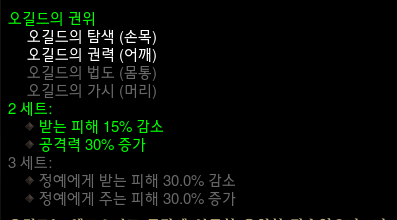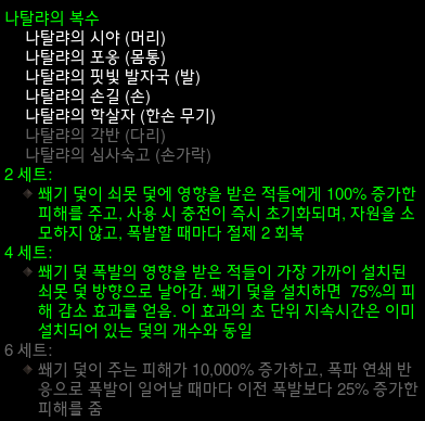 나탈랴의 복수 6세트, 오길드 2세트, 크림슨 선장의 장식 2세트, 끝없는 걸음 2세트를 사용한다.