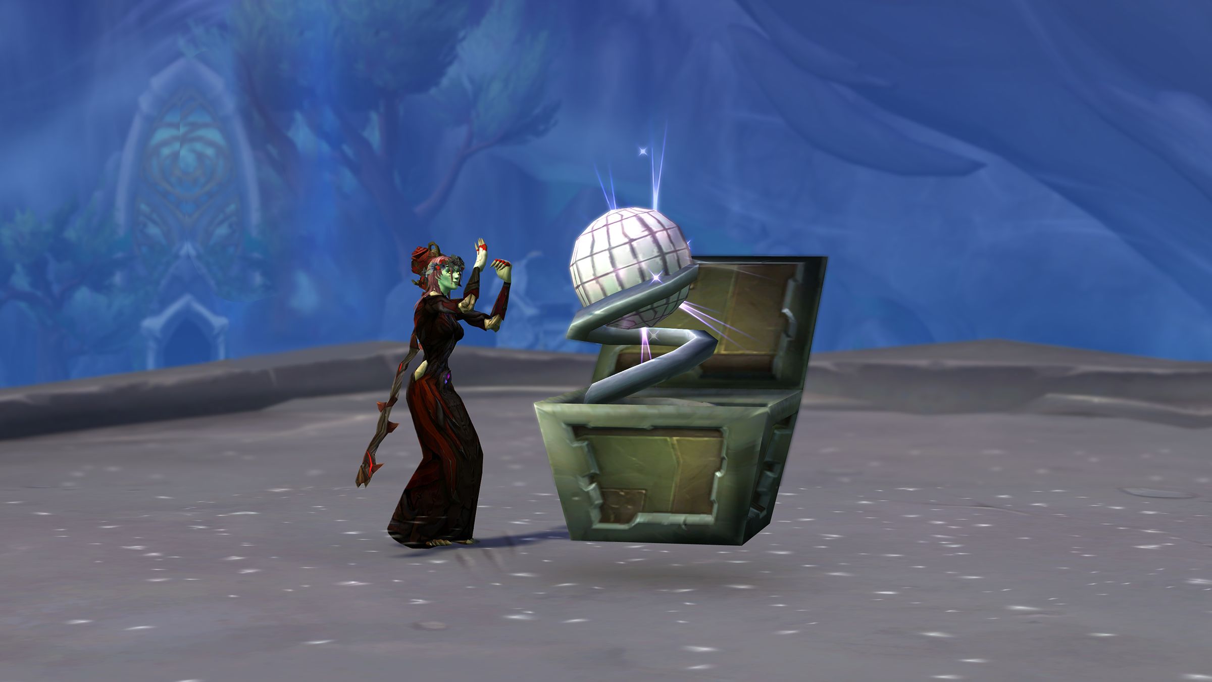 트위치 드롭스가 활성화됐을 때 아무 채널에서 WoW: 용군단 콘텐츠 방송을 4시간 이상 시청하면 휘황찬란한 최첨단 음악 연주기 장난감을 받을 수 있음.