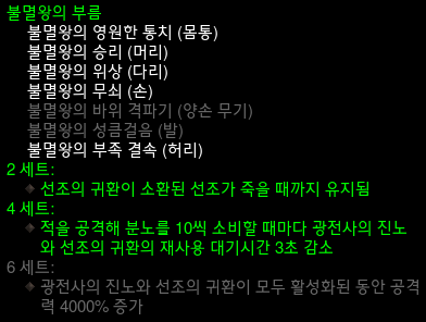 불멸왕의 부름 6세트 , 끝없는 걸음 2세트, 아혼 야만인의 무리 2세트를 사용한다