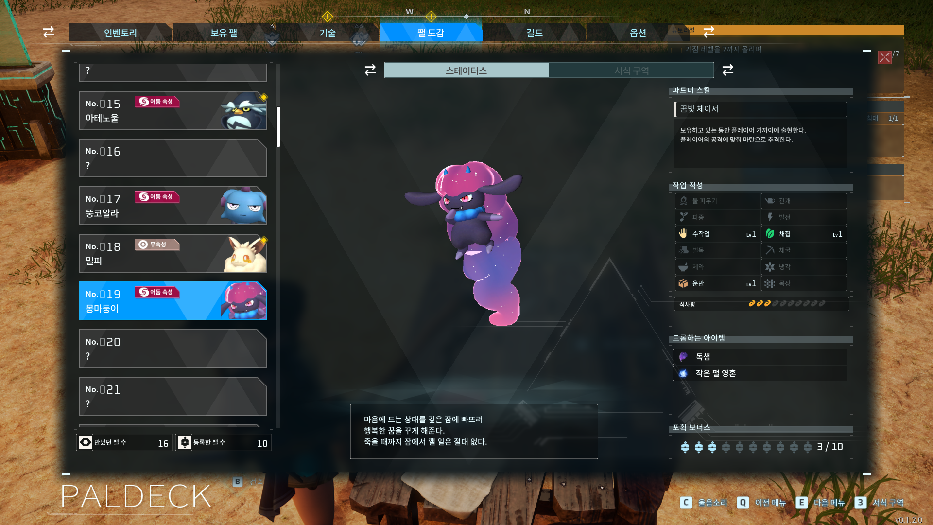 해당 팰을 몇번 잡았는 지는 팰 도감에서 확인이 가능하다.